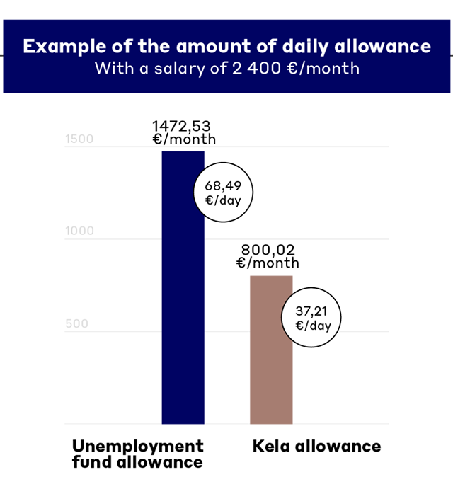The estimated amount of earnings-related unemployment allowance received from the unemployment fund compared to the amount of unemployment benefit received from Kela when the salary of the employee’s work alongside their studies is EUR 2,400. This is the amount of earnings-related unemployment allowance before taxes.